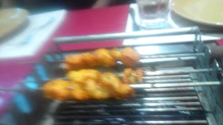 The concept of barbecue is present at each table where they seat coals and place food on skewers and place it on the top of coals.